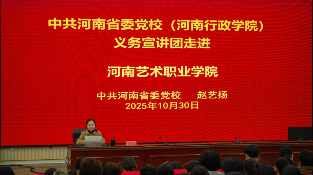 10月30日下午,中共河南省委党校(河南行政学院)义务宣讲团走进河南艺术职业学院,在报告厅成功举办习近平文化思想专题宣讲会。省委党校赵艺扬老师担任主讲。全校青年教师代表、入党积极分子约600人参加学习。